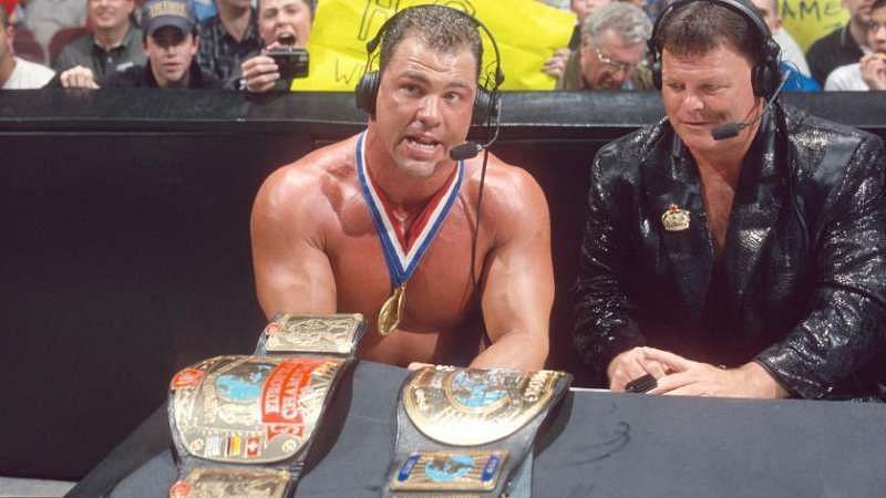 Back when he was in TNA, Kurt Angle was the true definition of a belt collector. We all have seen images of Kurt holding every title that existed in TNA. In WWE, Kurt has managed to also be a double champion when we won the European Championship on an episode of Smackdown and the Intercontinental Title a few weeks later at No Way Out 2000.