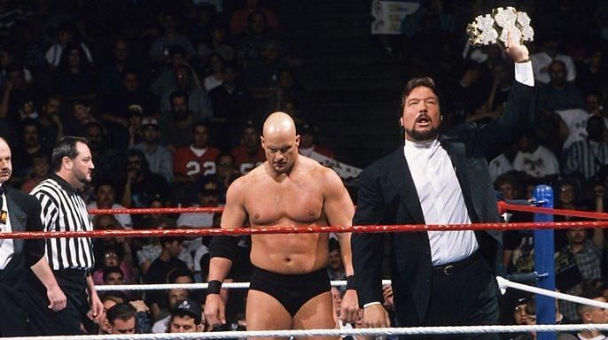 At the time, Austin was the defending Million Dollar Champion; under the name "The Ringmaster," the innovator of the wrestling podcast wore the diamond belt and rarely approached the microphone, letting his famous manager with the evil, greedy laugh do all the talking.