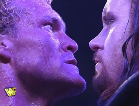 The Undertaker & Psycho Sid have an intense stare down as a purple shade of light reflects off their grim faces. Psycho Sid widens his eyes to show that he is not afraid of The Undertaker. What happens now?