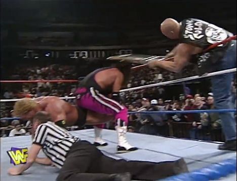 Wait, what the hell is Austin doing on the ring apron? Austin uses a chair & hits Bret right in the face with it! Referee Earl Hebner does not see anything.
