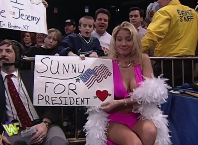 Rocky wins the match using a shoulder-breaker as expected (thank god that’s over). The last we see of Sunny tonight is her holding a “Sunny For President” sign.