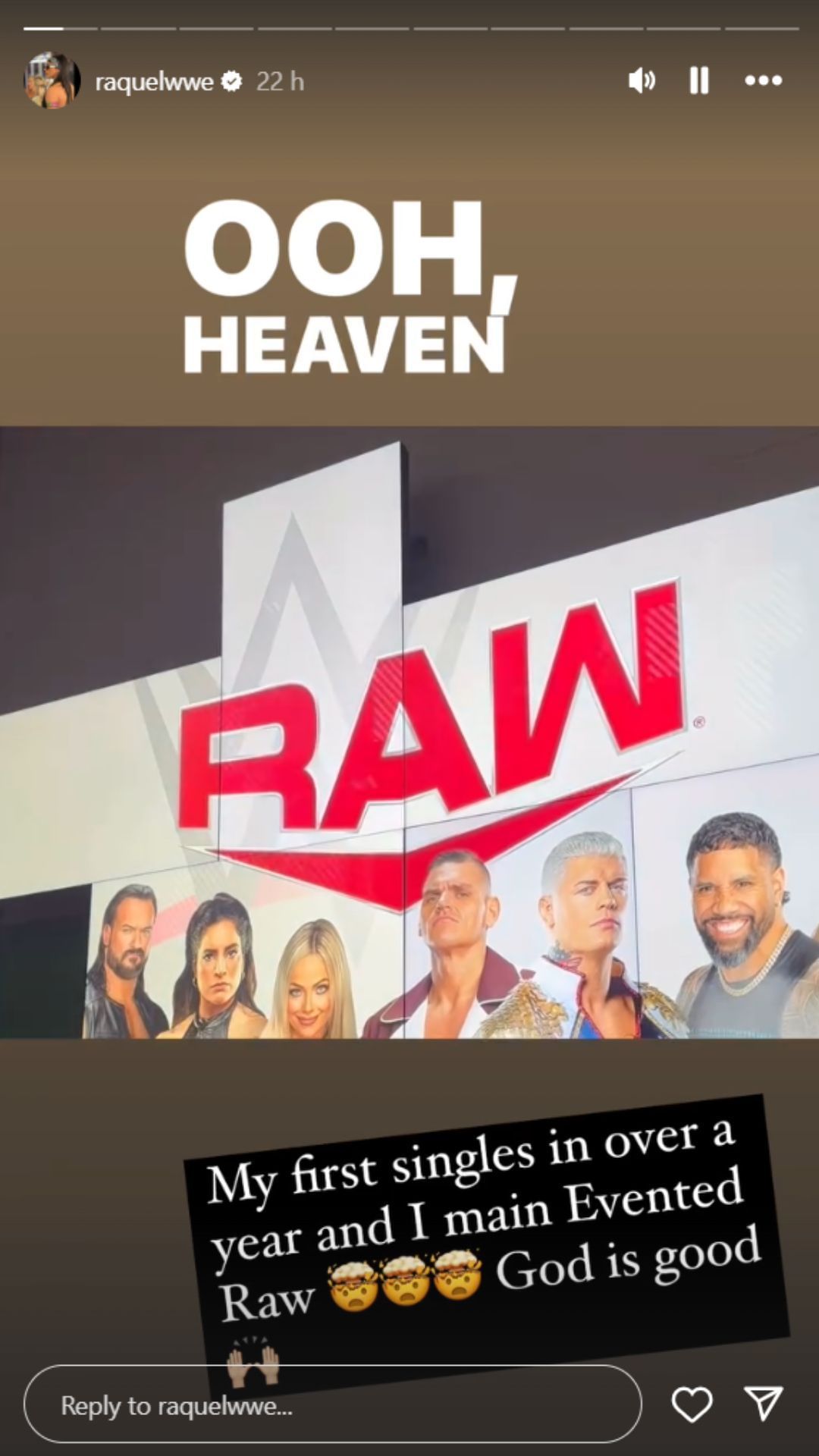 The Women's World Champion's challenger for this Saturday, IYO SKY, showed up to take her out of the equation. After scrapping for a while, Rhea Ripley hit her opponent with a Riptide through a table to secure the win. After the show, Raquel put aside her loss and posted an Instagram Story to express her gratitude for main eventing RAW.
