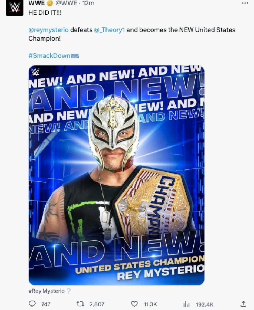 With this win, Mysterio has ended the 259-day reign of Austin Theory on WWE SmackDown.