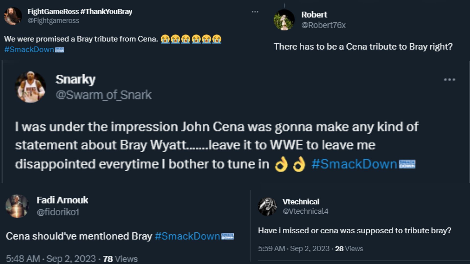 Fans, it appears, were very disappointed with the approach that WWE took with Cena's promo on his hugely hyped return to SmackDown. One fan straight up said that they were disappointed, while others called him and the company out for the lack of tribute to Wyatt.