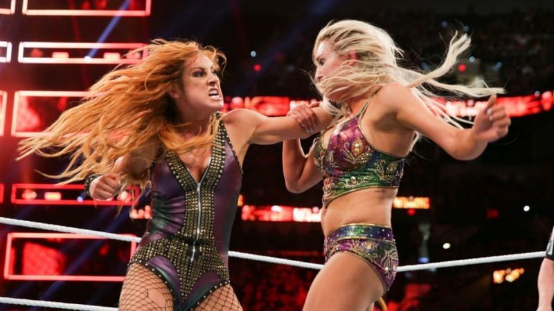 Both women avoided the other's submission moves early on. Charlotte was trying to weaken Becky's leg for a future Figure Eight. Becky sent Charlotte to the outside after an attack on the apron.
