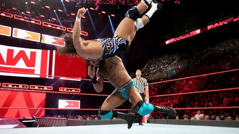 Chad Gable started the match strong, hitting a rolling kick as soon as the bell rung before running rings around Jinder. Jinder won control for the first time with a shoulder charge, knocking Gale off the apron.