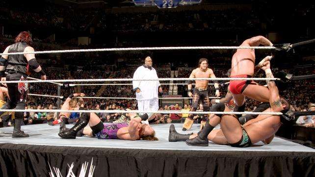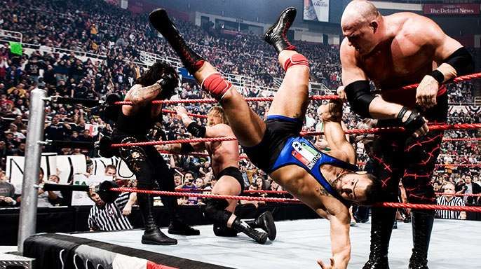 The previous record stood at 7 from the 1994 Royal Rumble, when it took 7 men to eliminate Viscera’s alter-ego Mabel from the Royal Rumble match.