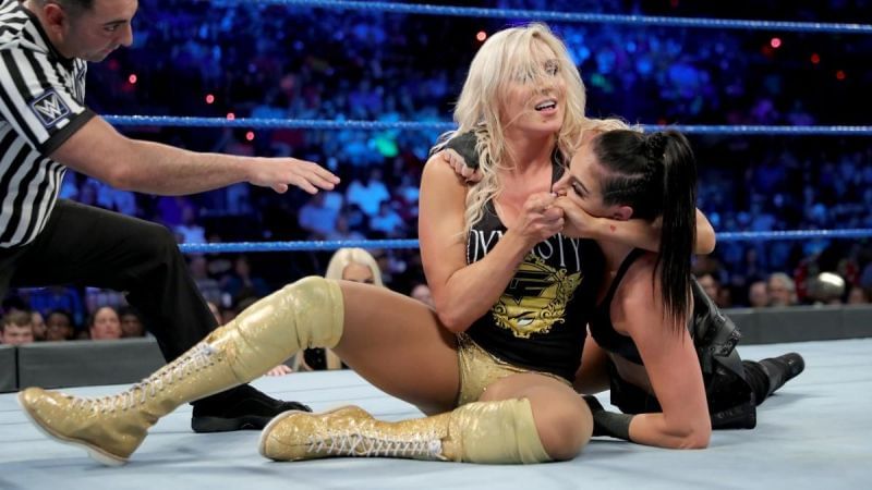 DeVille started off strong with a flurry of offence against Flair. Charlotte countered a sunset flip into a new move, a knee pressing her head down. Mandy Rose's distraction fails and results in Charlotte whacking DeVille in the face with the big boot.
