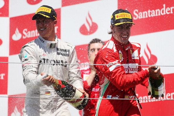 VALENCIA, SPAIN – JUNE 24: Race winner Fernando Alonso (R) of Spain and Ferrari celebrates on the podium with third placed Michael Schumacher of Germany and Mercedes GP following the European Grand Prix at the Valencia Street Circuit on June 24, 2012 in Valencia, Spain. (Photo by Mark Thompson/Getty Images)