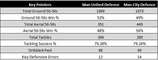 The statistical comparison highlights United defence being caught off-guard way more often than City, which is solely down to poor marking duties from the full backs. Yet, when we take a look at the number of defensive errors for both the sides, there isn’t much to choose from, which is surprising considering City’s efficient defensive displays this season. Probably, it’s also about the aura that surrounds the City defence that helps them counter several attacking bouts and United will need to work very hard to discard the sloppiness of their performances.