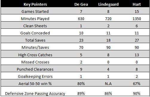 It is visible that David De Gea has been the busiest of the lot with a save to make every 70 minutes. Moreover, with all the criticism about the aerial aspects of the Spaniard’s ‘keeping, it is rather startling to see him making a point with 9 punched clearances in the 7 games he has played this season. Anders Lindegaard has done enough to keep himself in contention for the derby game, as his ability to handle aerial battles are well documented in his statistic column.