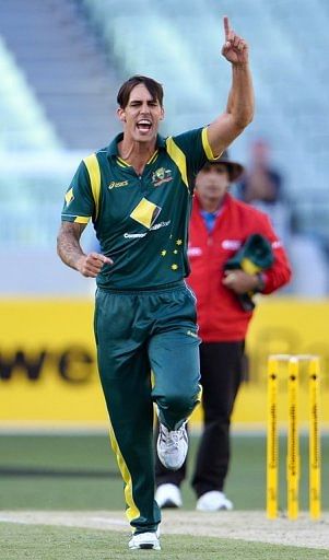 Australian bowler Mitchell Johnson celebrates dismissing West Indies batsman Kieran Powell on February 10, 2013. He was suspended late Monday, along with three other Australian players, plunging the Test side into crisis.