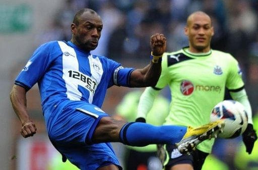Wigan Athletic’s Barbadian defender Emmerson Boyce (L) clears the ball away from Newcastle United’s French forward Yoan Gouffran during the English Premier League football match at The DW Stadium in Wigan on March 17, 2013. Wigan did their chances of escaping relegation from the Premier League yet again a whole host of good as they beat Newcastle 2-1 in controversial fashion on Sunday.