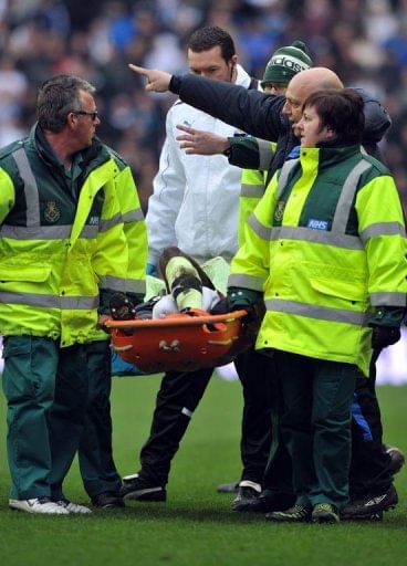 Newcastle United’s French defender Massadio Haidara is stretchered off the pitch after being injured in a tackle by Wigan Athletic’s English striker Callum McManaman during the English Premier League football match between Wigan Athletic and Newcastle United at The DW Stadium in Wigan, north-west England, on March 17, 2013.