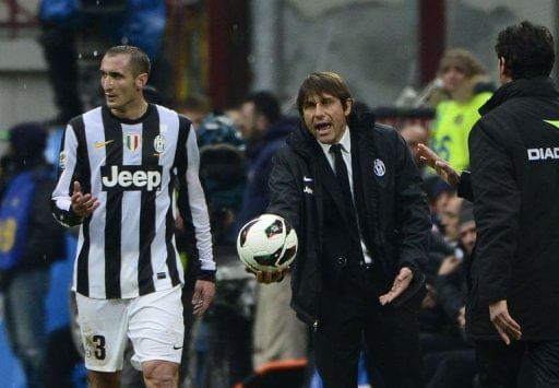 Juventus’ coach Antonio Conte gestures with a ball during the Italian serie A football match between Inter Milan and Juventus, on March 30, 2013, at the San Siro stadium in Milan. Juve won 2-1.