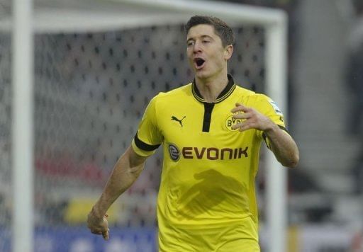 Dortmund’s Polish forward Robert Lewandowski celebrates after he scored his team’s second goal during the German first division Bundesliga football match between VfB Stuttgart and Borussia Dortmund in Stuttgart, on March 30, 2013. Borussia Dortmund won 2-1