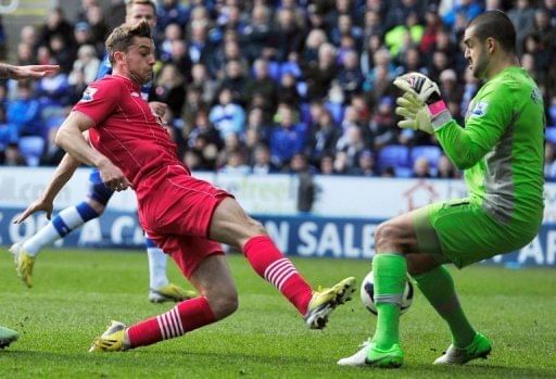 Southampton striker Jay Rodriguez (L) scores the opening goal during the English Premier League football match against Reading in Reading on April 6, 2013. Reading’s hopes of avoiding relegation from the Premier League were seriously compromised after a 2-0 loss to manager Nigel Adkins’ former club left them seven points from safety with only six games remaining.