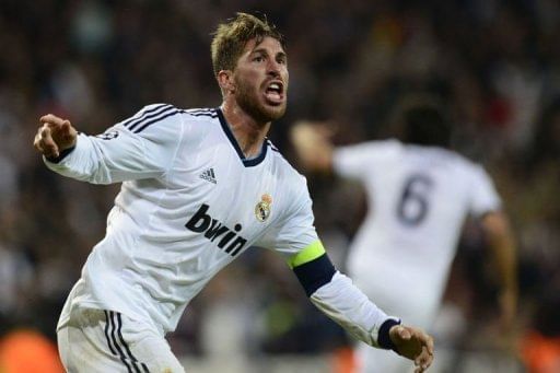 Real Madrid’s defender Sergio Ramos celebrates after scoring during their UEFA Champions League semi-final second leg football match against Borussia Dortmund at the Santiago Bernabeu stadium in Madrid on April 30, 2013. Real Madrid won 2-0, but Dortmund go through on aggregate.
