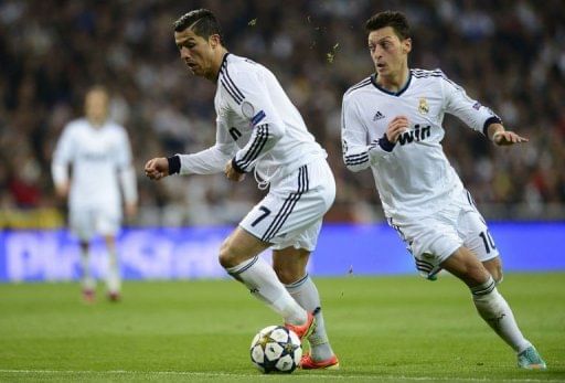 Real Madrid’s forward Cristiano Ronaldo (L) controls the ball next to midfielder Mesut Ozil during their UEFA Champions League semi-final second leg football match against Borussia Dortmund at the Santiago Bernabeu stadium in Madrid on April 30, 2013. Borussia Dortmund qualified for only the Champions League final as they prevailed 4-3 on aggregate.