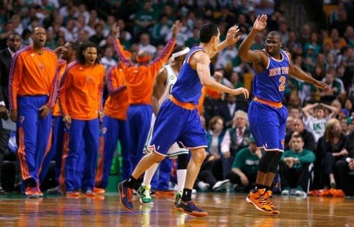New York Knicks’ Pablo Prigioni and Raymond Felton celebrate during the game against the Boston Celtics on May 3, 2013 in Boston.