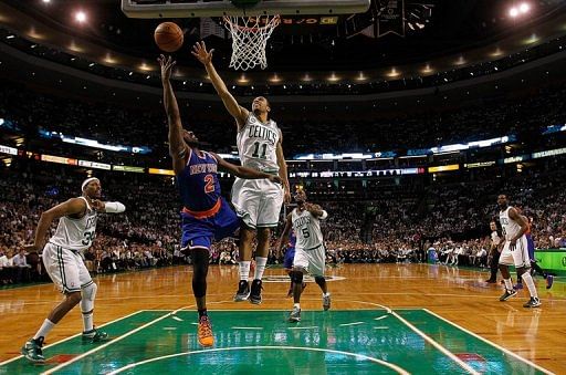 Courtney Lee #11 of the  Celtics tries to block a shot by Raymond Felton #2 of the Knicks, May 3, 2013 in Boston