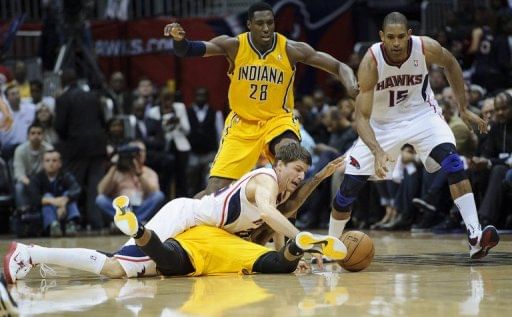 Kyle Korver of the Atlanta Hawks and Paul George of the Indiana Pacers fight for a loose ball, May 3, 2013 in Atlanta