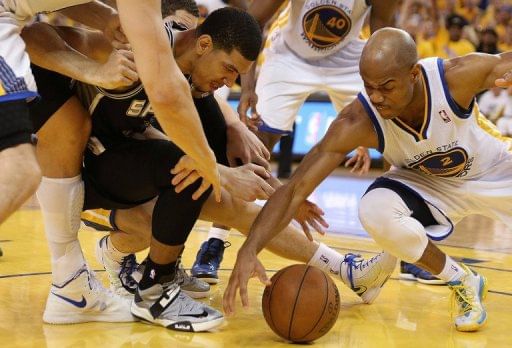 Jarrett Jack (R) of the Golden State Warriors battles for the ball with Danny Green of the San Antonio Spurs in Game Four of the Western Conference semi-finals during the 2013 NBA Playoffs at the Oracle Arena in Oakland, California, on May 12, 2013. The Warriors delivered a dominant performance in o/t to complete a 97-87 come from behind win and level their playoff series.