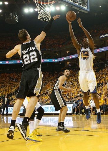 Harrison Barnes (R) of the Golden State Warriors shoots against the San Antonio Spurs in Game Four of the Western Conference semi-finals during the 2013 NBA Playoffs, at the Oracle Arena in Oakland, California, on May 12, 2013. The Warriors delivered a dominant performance in o/t to complete a 97-87 come from behind win and level their playoff series.