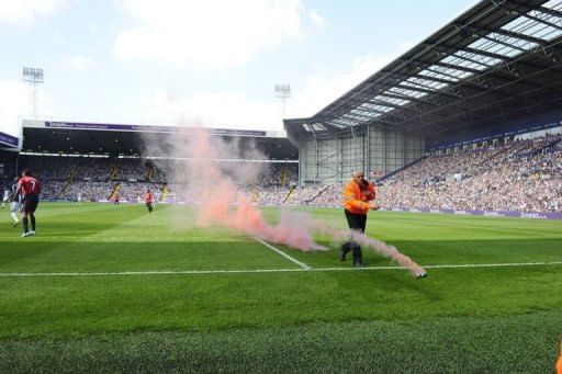 A steward removes a smoke bomb during the English Premier League football match between West Bromwich Albion and Manchester United at The Hawthorns in West Bromwich, central England, on May 19, 2013. The match ended in a 5-5 draw.