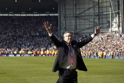 Manchester United’s Scottish manager Alex Ferguson acknowledges fans at the end of the English Premier League football match between West Bromwich Albion and Manchester United, his last game before retirement, at The Hawthorns in West Bromwich, central England, on May 19, 2013. The match ended 5-5.