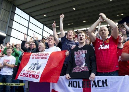 Manchester United fans sing after their team scored in West Bromwich on May 19, 2013