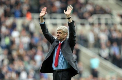 Arsenal’s manager Arsene Wenger salutes to the fans at the end of their English Premier League match against Newcastle United and Arsenal, at St James’ Park in Newcastle Upon Tyne, northeast England, on May 19, 2013. Wenger admitted he is delighted Arsenal proved the critics wrong after his team secured their place in the Champions League with a 1-0 win.