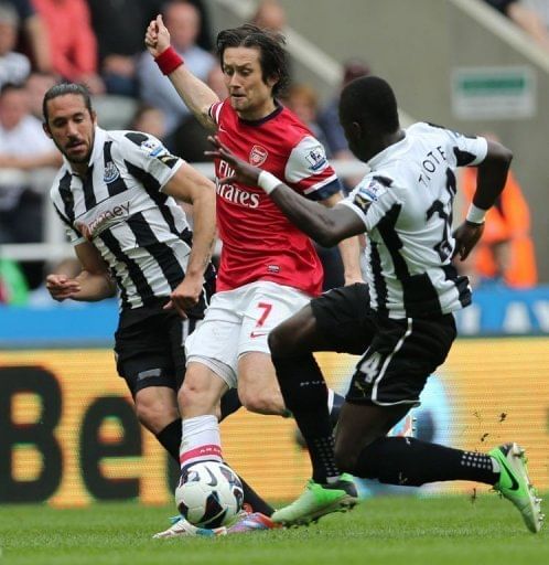 Arsenal’s Tomas Rosicky (C) fights for the ball with Newcastle United’s Cheick Tiote and Jonas Gutierrez during their English Premier League match at St James’ Park in Newcastle Upon Tyne, northeast England, on May 19, 2013. Arsenal won 1-0.