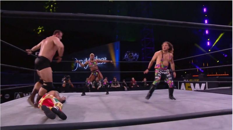 Joey hit a thrust kick and tagged Sonny Kiss. Kiss and Janela had Morales in an intricate double submission move that forced Gargis to intervene.