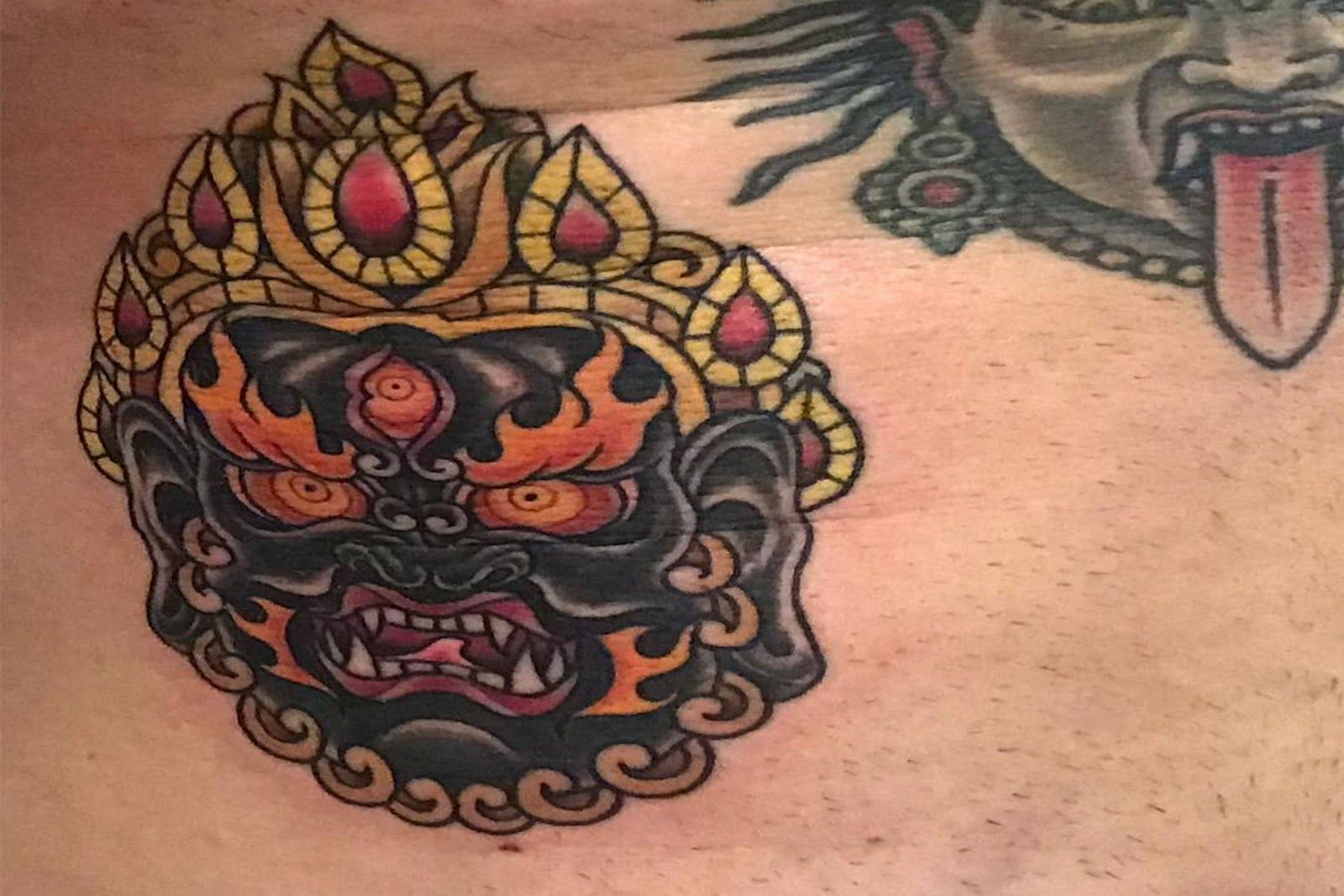 Malakai’s chest and midsection feature a trio of Hindu deities, with Mahakala positioned beneath Kali and adjacent to Yama. Mahakala, revered as the god of time, creation, destruction, and power, holds a significant place in Hindu mythology. Known for his fearsome aspect, Mahakala is also the formidable husband of Mahakali. As a couple, they embody the potential for utter annihilation, being the deities associated with destruction and the end of the world.