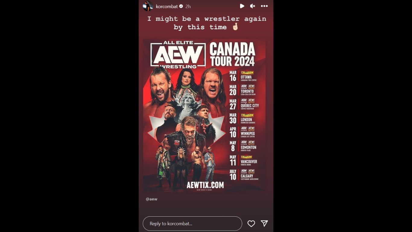 AEW recently announced their Canada Tour dates in 2024, and it seems like Kyle O'Reilly has taken an interest in the company touring his home country. O'Reilly took to Instagram and reposted the story while hinting at a possible in-ring return.