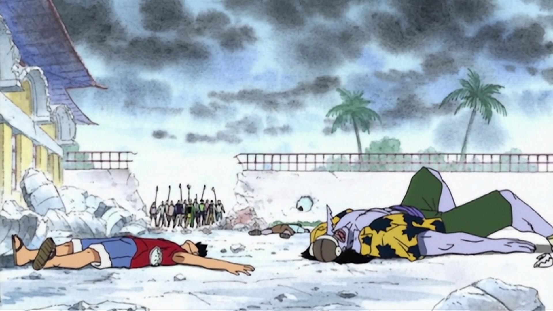 The fiery tension between the two regarding Going Merry’s condition comes to a head as the two confront each other. Usopp takes advantage of Luffy’s simple-mindedness by preparing several booby traps and weapons to use against his former captain. Eventually, Luffy adjusts and ends the fight with one punch, knocking Usopp out while crying over his unconscious body.