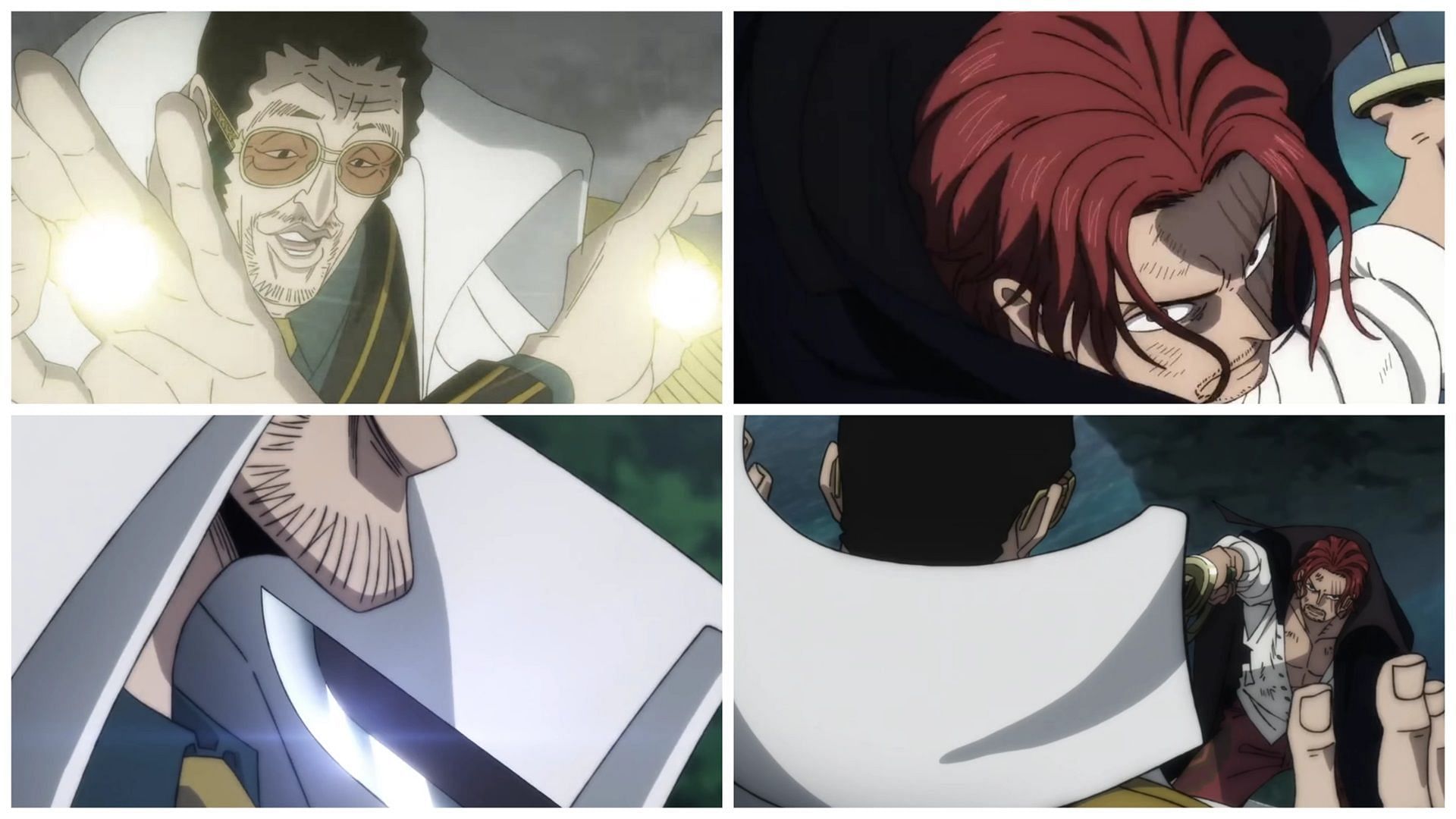 Kizaru attacks Shanks with his signature technique, Yasakani no Magatama, but Shanks deflects the laser barrage with his sword, Gryphon. The "Red Hair" then sends a flying slash at Kizaru, which the Admiral dodges. As Kizaru uses his Glint-Glint Fruit to leap back at light speed, Shanks showcases enough swiftness to intercept and outpace his movement.