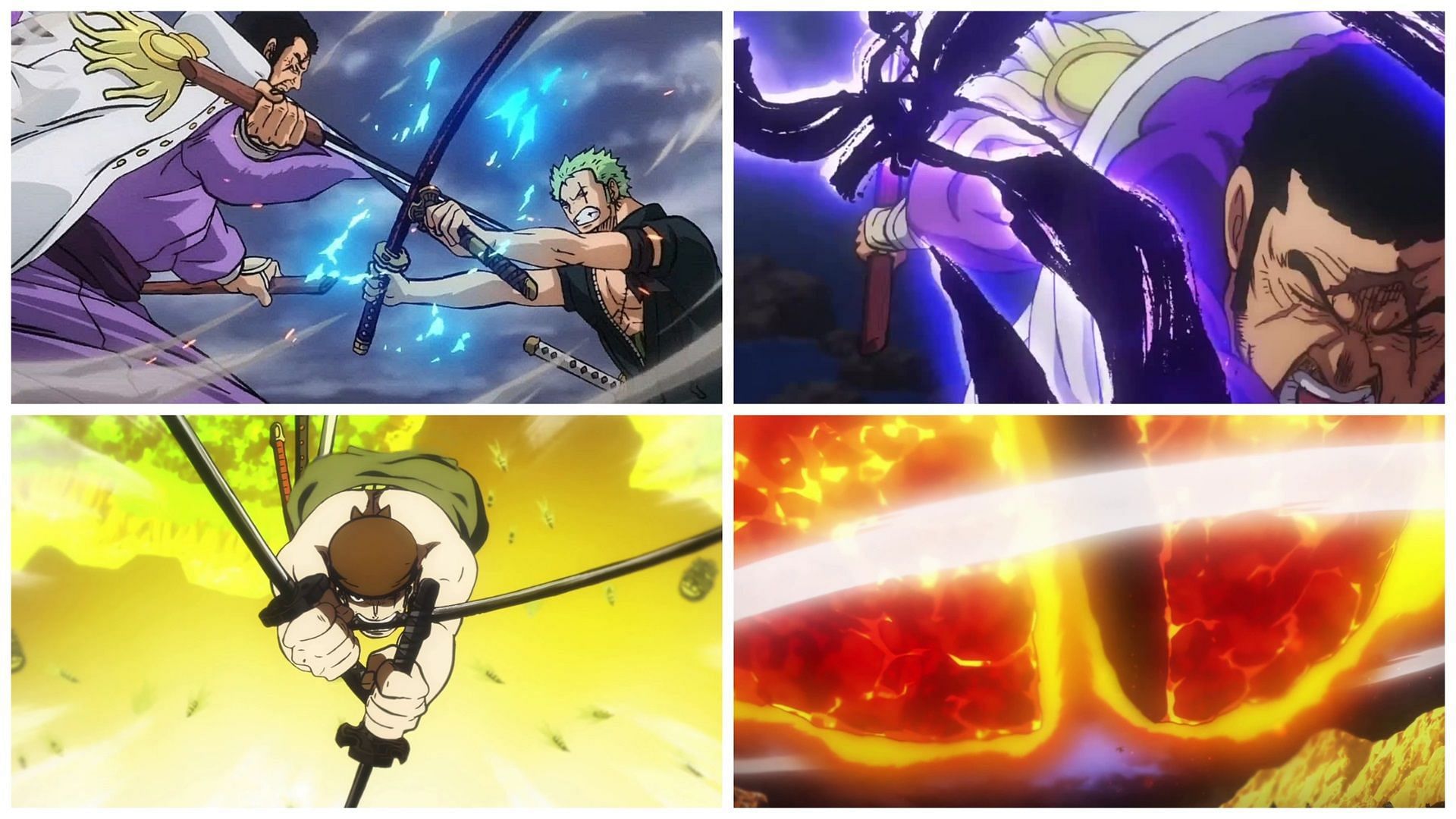 Seeing that Bullet has made his move, Fujitora leaves the scene after using his Press-Press Fruit to bring down a meteorite and throw it at Zoro. However, Zoro counters the attack by unleashing his Three Sword Style: Billion-fold World Trichiliocosm to bisect the meteorite.
