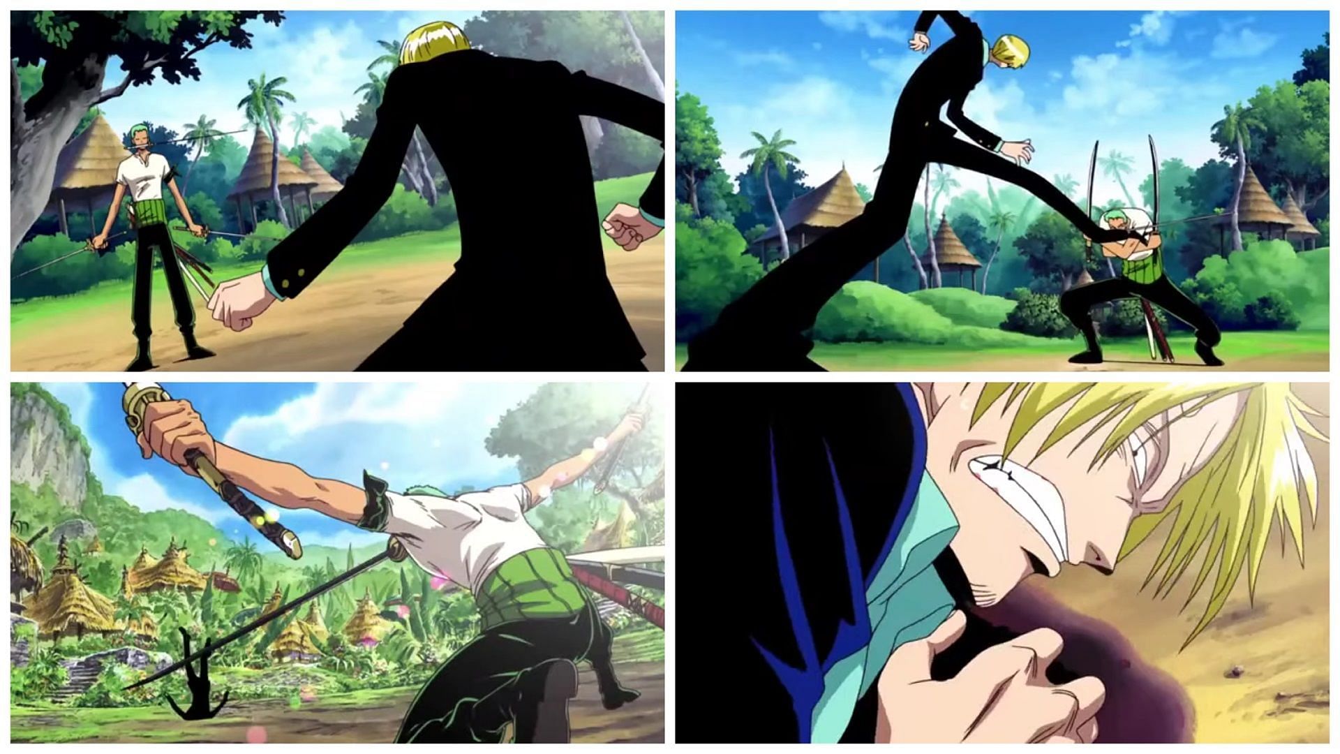 After a few exchanges of blows, in which both dodge each other's attacks, Zoro mocks Sanji for putting himself in a vulnerable position against a swordsman. Zoro then uses the sword in his mouth to block Sanji's kick. Next, he uses his other two swords to attack Sanji before he can react, leaving him injured badly. Soon after, Zoro leaves the scene while Chopper and Nami tend to Sanji's wounds.