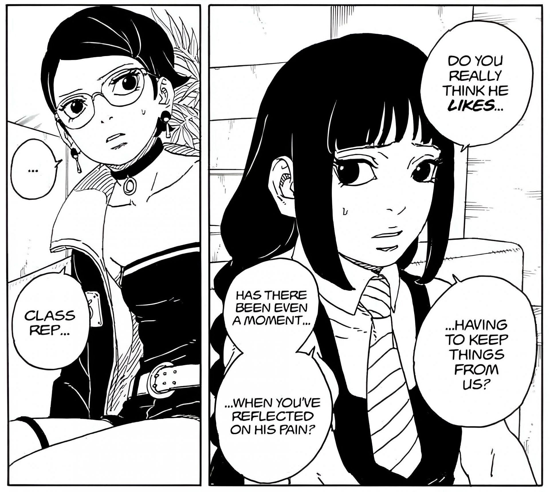 The manga then switched to Eida and Daemon's residence as it was Sarada who asked Eida to find out why Boruto was keeping secrets from them. Having become a singularity of fate, Eida refrained from leaking information about Boruto and Kashin Koji. However, Sarada wasn't happy with this development and pushed Eida for more information.