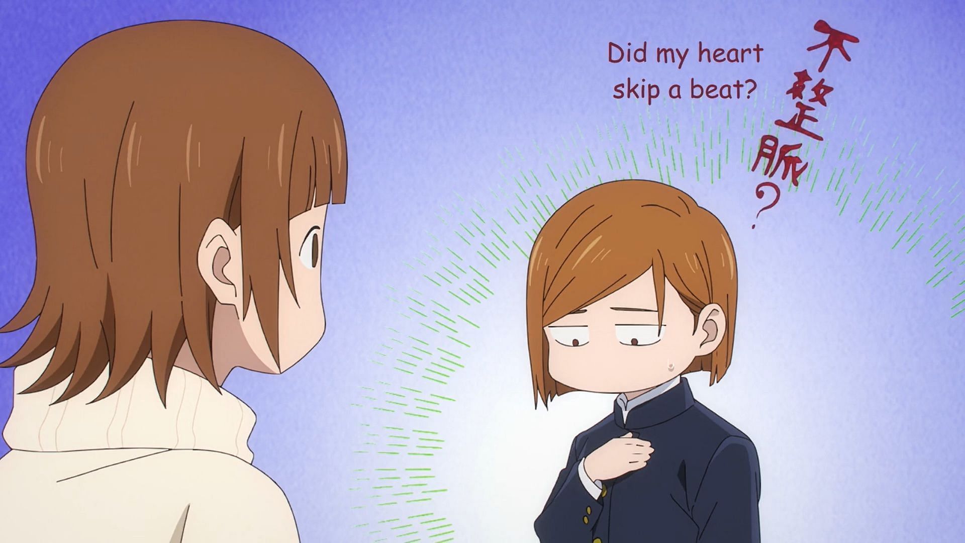 The "skipping a heartbeat" phrase could also be read as "feeling a strange sensation in the heart," which Nobara later expresses at the end of the episode. The idea of Yuji getting a romantic partner before her irked her and that's why the strange feeling. Even mangaka Gege Akutami confirmed in an interview with Mando Kobayashi that this part was merely to popularize Yuji among female viewers and does not hold any significance to the plot.