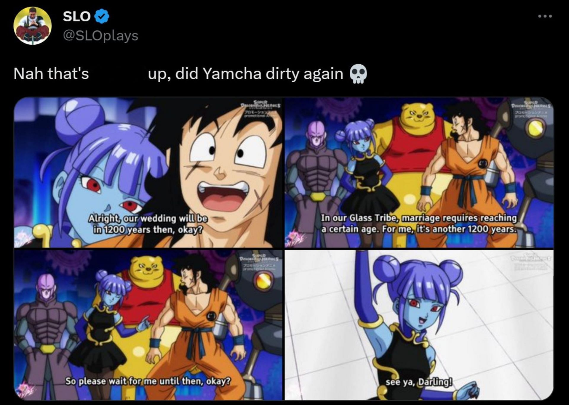 A recent episode of Super Dragon Ball Heroes Ultra God Mission saw Yamcha finally getting a girlfriend, Vidro. As he was stoked to marry her, Vidro revealed a piece of information that left Yamcha shocked to the core. As per what she revealed, in her Glass Tribe, marriage requires individuals to reach a certain age, and Vidro will have to wait for another 1200 years to get married.