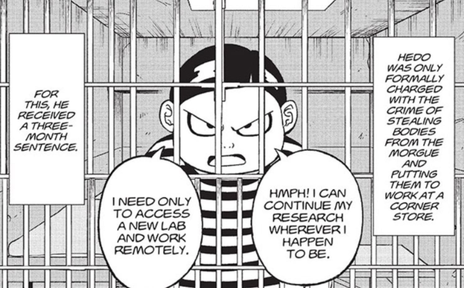 Only then was it revealed that Dr. Hedo had no interest in Dr. Gero's work and was only after Trunks and Goten to retrieve the disk container, in which he had kept his Clean God autograph. It was later revealed that Dr. Hedo allowed his zombies to return to their homes, which subsequently reduced his sentence. However, he was still adamant about conducting research.