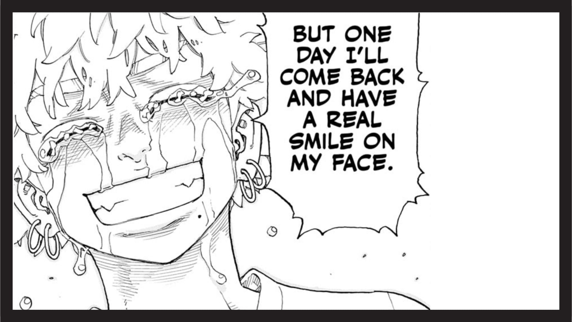 Kuran used his Cheshire Astro to transform into his older self, as otherwise, he would not be able to express emotions. With the tears streaming down his face, he gave a smile and promised that one day he would return a genuine smile.