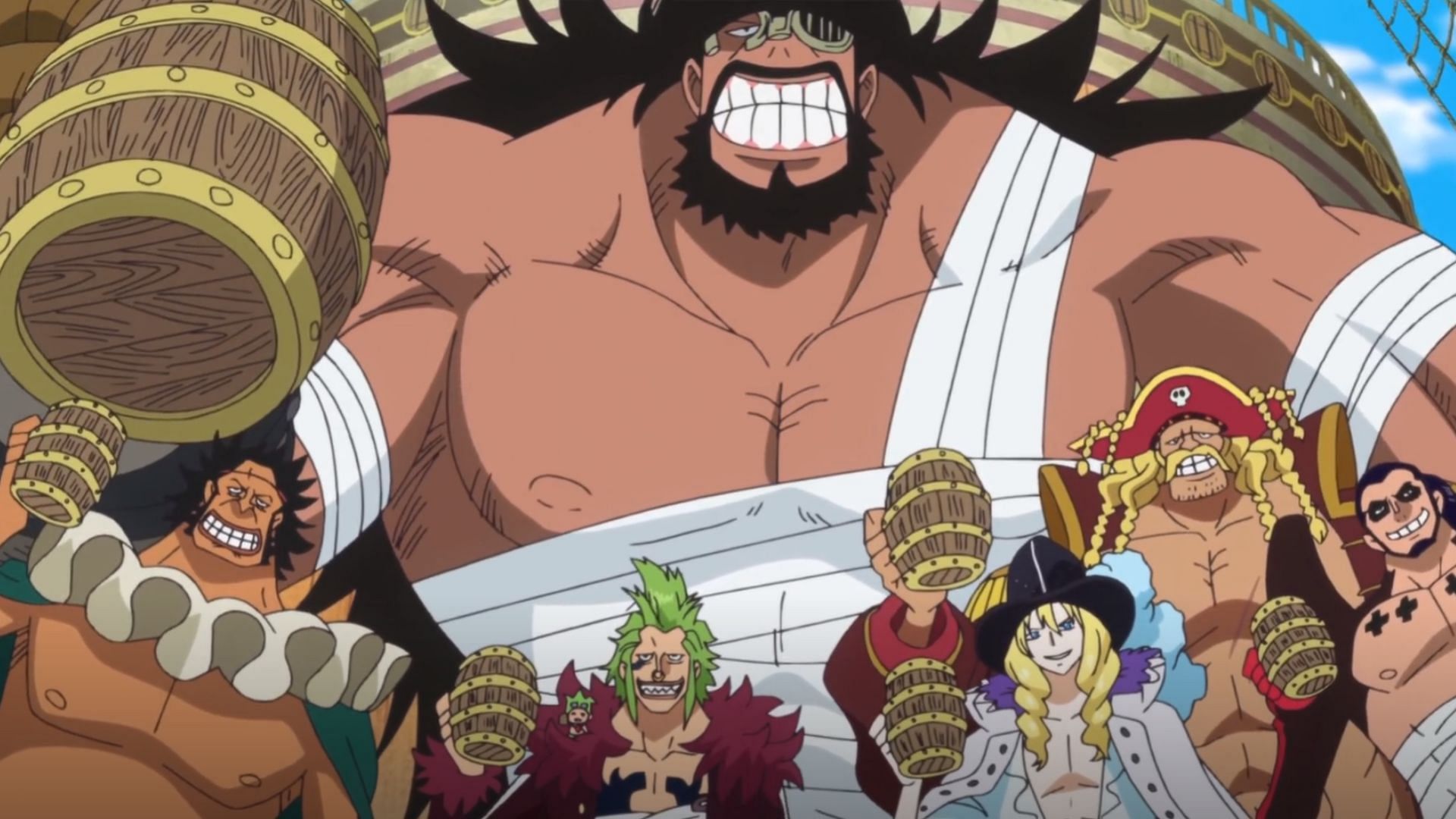 The Straw Hat Grand Fleet, an alliance of seven pirate crews including the Beautiful Pirates led by Cavendish, Barto Club led by Bartolomeo, Happo Navy led by Sai, Ideo Pirates led by Ideo, Tontatta Pirates led by Leo, New Giant Warrior Pirates led by Hajrudin, and Yonta Maria Grand Fleet led by Orlumbus, was established during the Dressrosa Arc. This alliance boasts over 5000 members from diverse tribes and races.