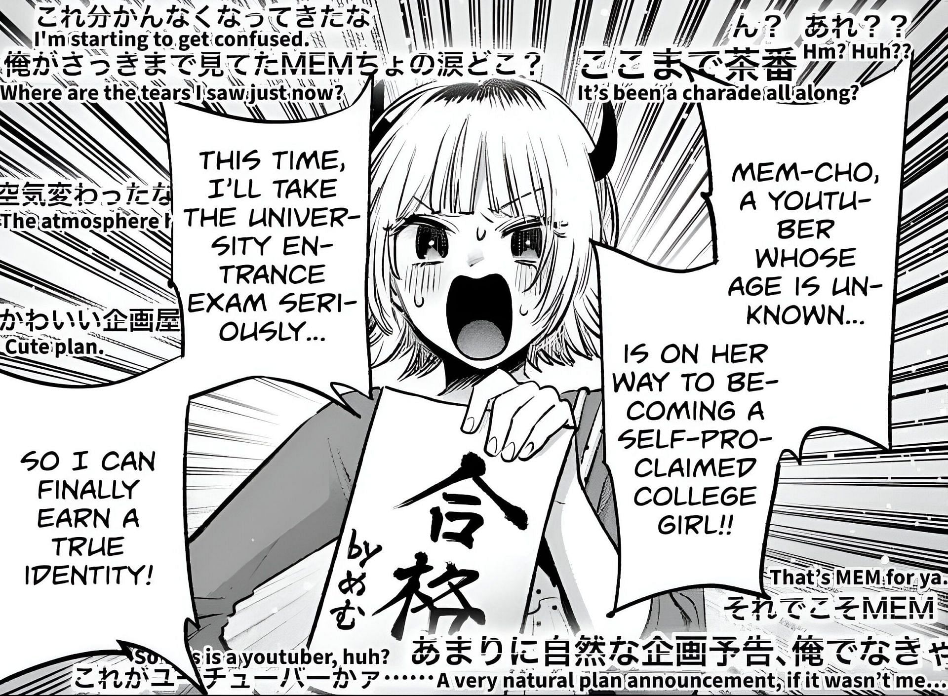Right after, the manga saw Mem-Cho speaking with Kana Arima. Kana praised Mem-Cho for the way she handled her situation. Now, even if a tabloid were to report her real age, she had already revealed that she had lied about the same to sell herself to her fans. Moreover, Mem-Cho also attained the new attribute "The Age-Unknown Idol YouTuber" and increased her channel's growth. Thus, there was nothing left to worry about.