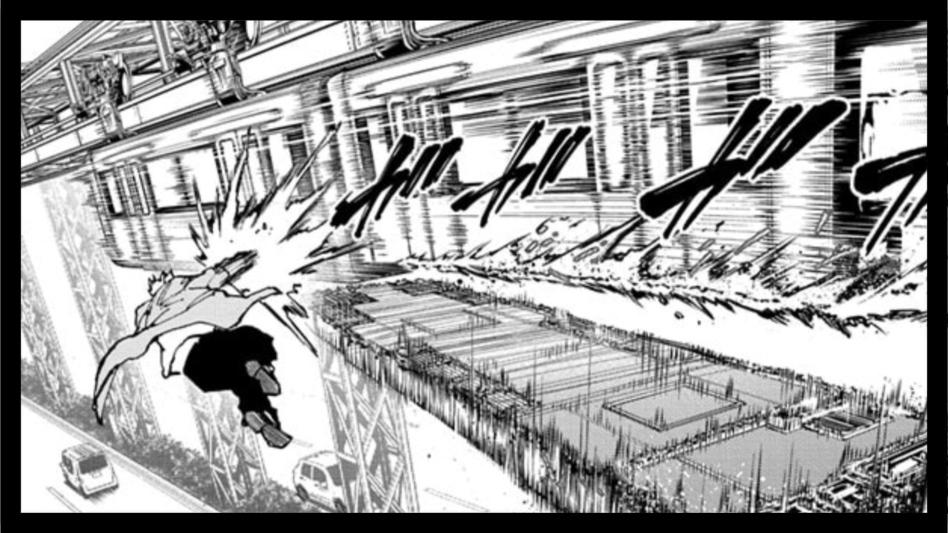 Their battle moved to a suspended train. After Sakamoto crashed into one of the train cars, Torres removed the floor, and a child almost fell. Sakamoto, though, saved the child.