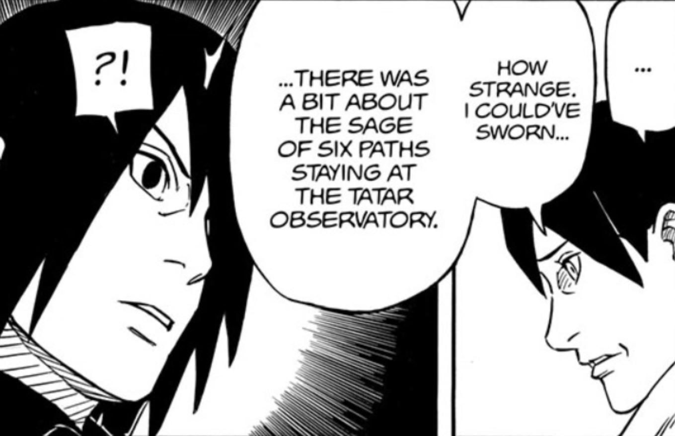 However, upon realizing that certain pages had gone missing, she mentioned how there were texts retracing back to the Sage of Six Paths' time in the Tatar Observatory, which led Sasuke to his next location in his search for a cure. While Sasuke spends his time in the observatory, he finds some new intriguing mysteries surrounding the Land of Redaku.