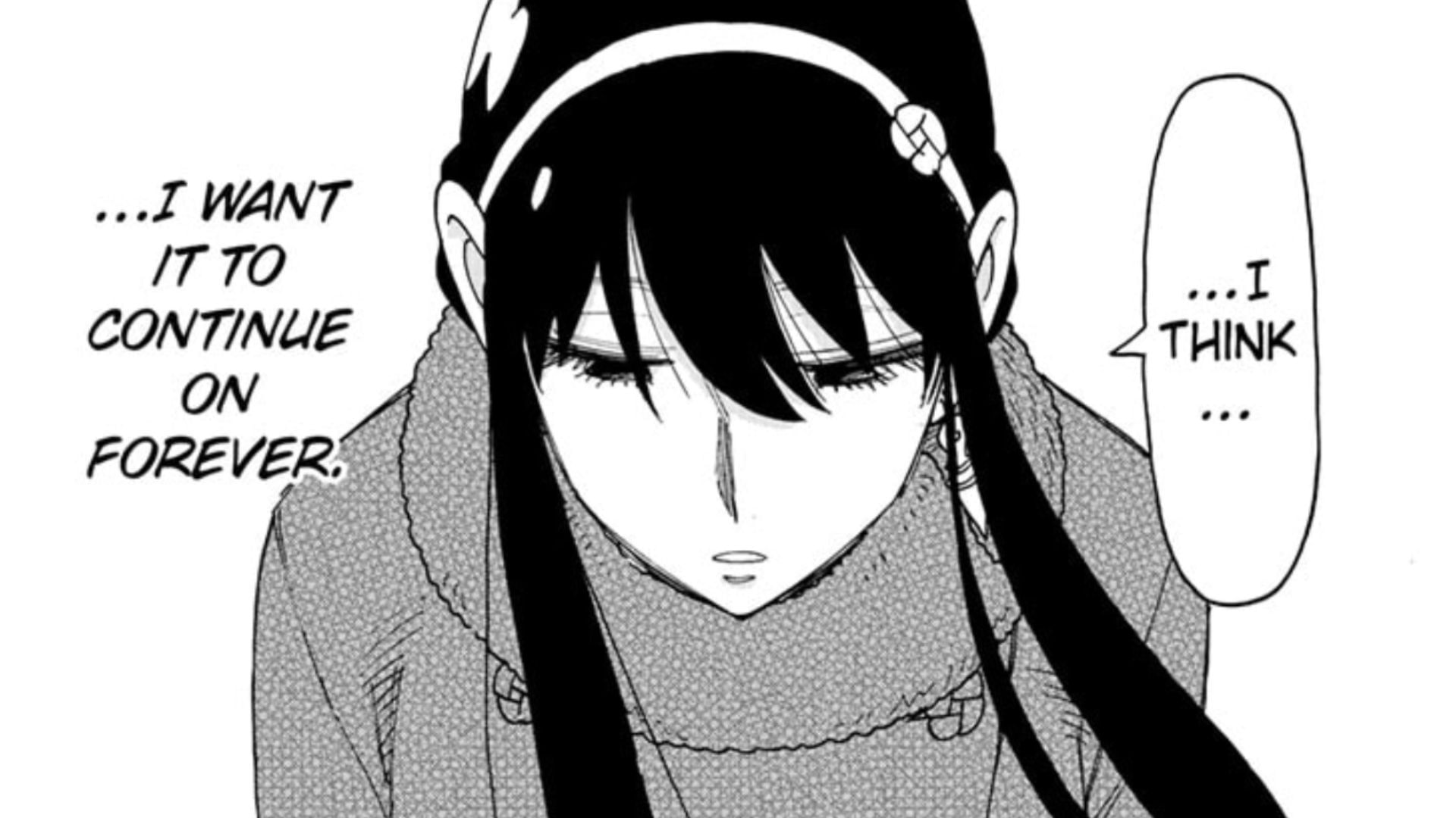 Amidst this, she expressed that although she believed their agreement would last until Anya graduated, she wanted something else. During this, Yor thought to herself that she wanted to continue their marriage forever. While Yor did not say those words, Loid inferred and said that they could keep the arrangement going as long as Yor wanted, arguing it would also make Anya happy.